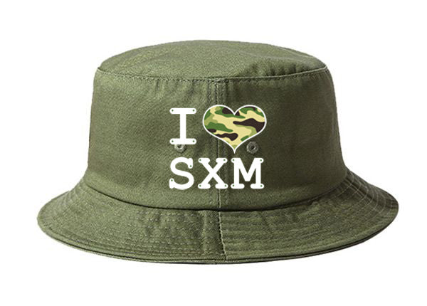 The olive-green base pairs perfectly with the camo-patterned heart, making it a standout accessory for locals, visitors, and SXM lovers everywhere. Functional, fashionable, and unmistakably Caribbean—this bucket hat is the perfect way to represent Saint Martin/St. Maarten with pride.
